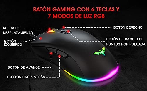 【 6 teclas Ratón programable para juegos】 6DPI niveles: 800-1600-2400-3200-4000-4800DPI. 6 teclas programables, la iluminación RGB de ratón se puede personalizar a través del controlador. Apague fácilmente la luz del mouse con el botón de luz.